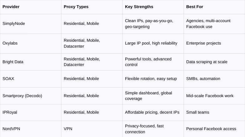 Several providers operate in the proxy seller space for social media, including Bright Data, Oxylabs, SOAX, Decodo (formerly Smartproxy), and IPRoyal. Each has different strengths, and not all proxies work equally well for Facebook.