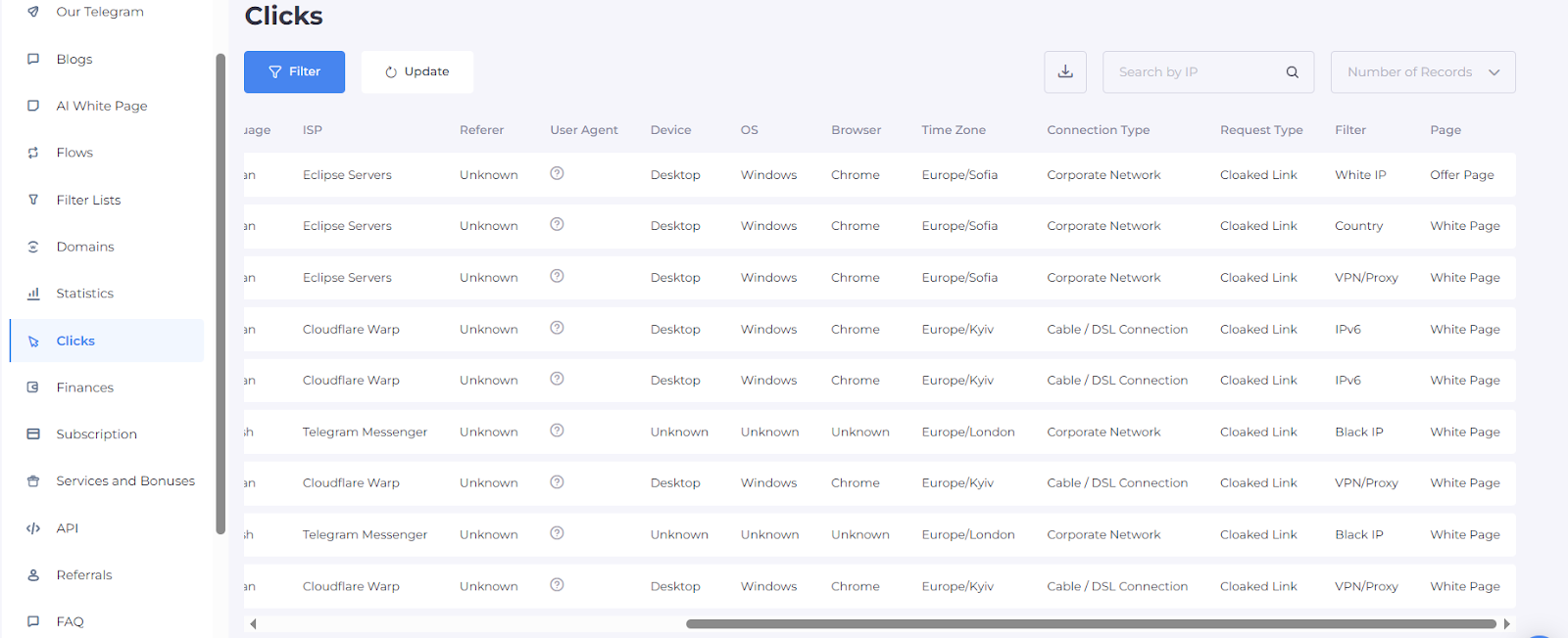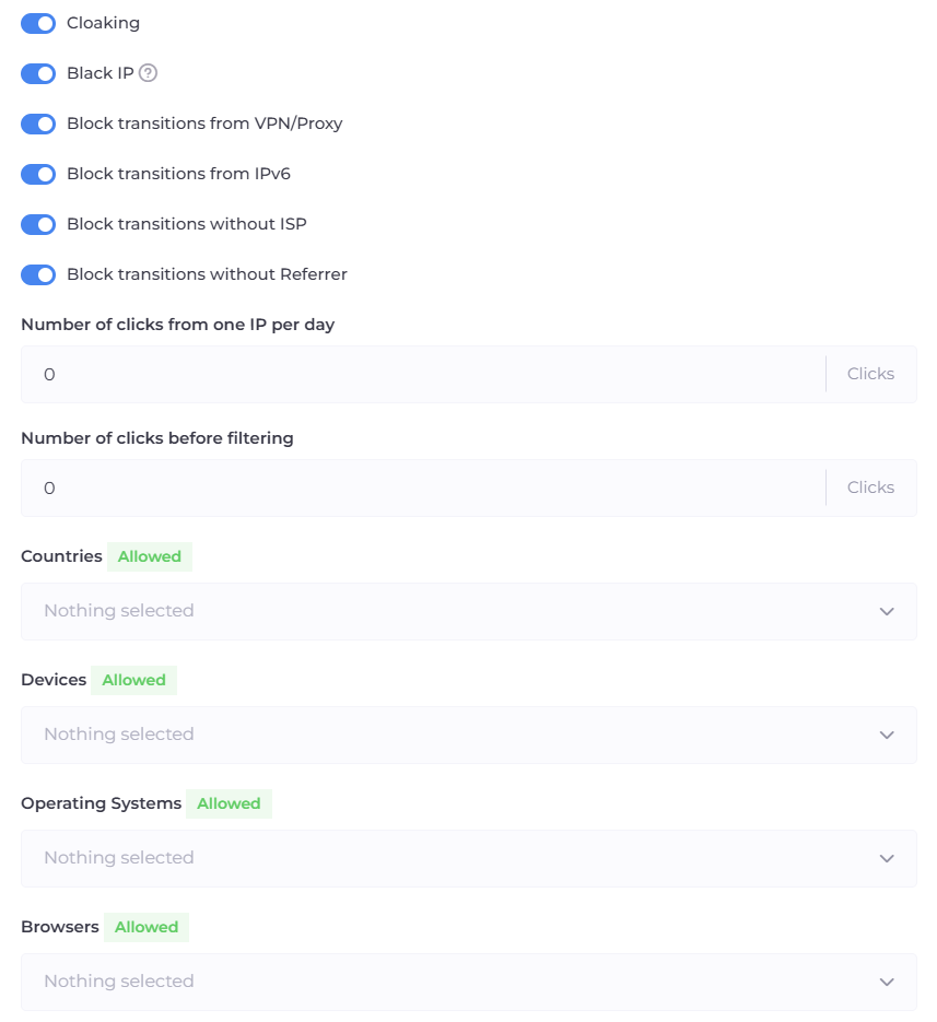 Cloaking House places strong emphasis on flexible traffic management: filtering is available by country, device, operating system, browser, and language. You can also separately restrict traffic with no referer, traffic from unknown providers, and build whitelists and blacklists by IP, ISP, and User-Agent.