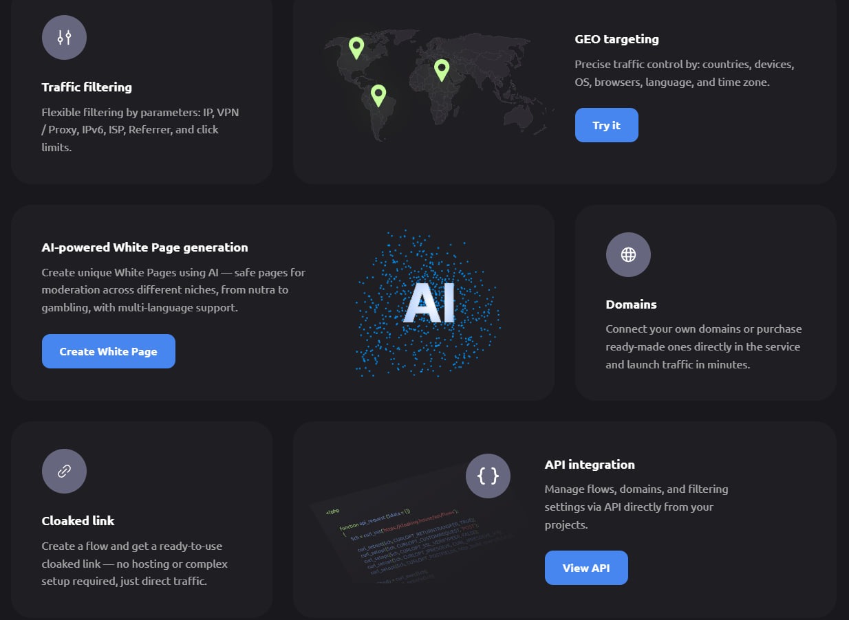 That is why a good technical solution should not only protect the setup, but also avoid making the launch process more complicated. One of Cloaking House’s strengths is that the initial setup is relatively simple: you can upload a PHP file to the park of the domain, use a safe link through a parked domain, and configure the traffic flow without a heavy multi-step build. The service also includes white-page generation based on niche, topic, and offer language, as well as API access for integration into a team’s internal processes.