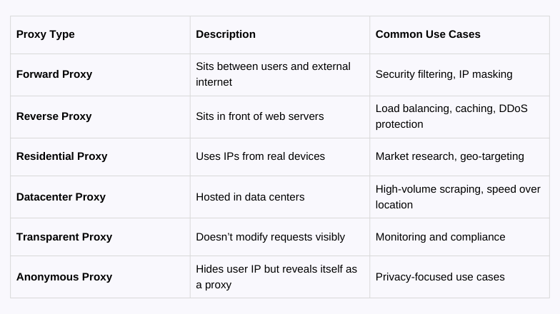 Different types of proxies, such as residential, datacenter, or reverse proxies, handle specific network functions, from scraping data to protecting backend servers from direct exposure.
